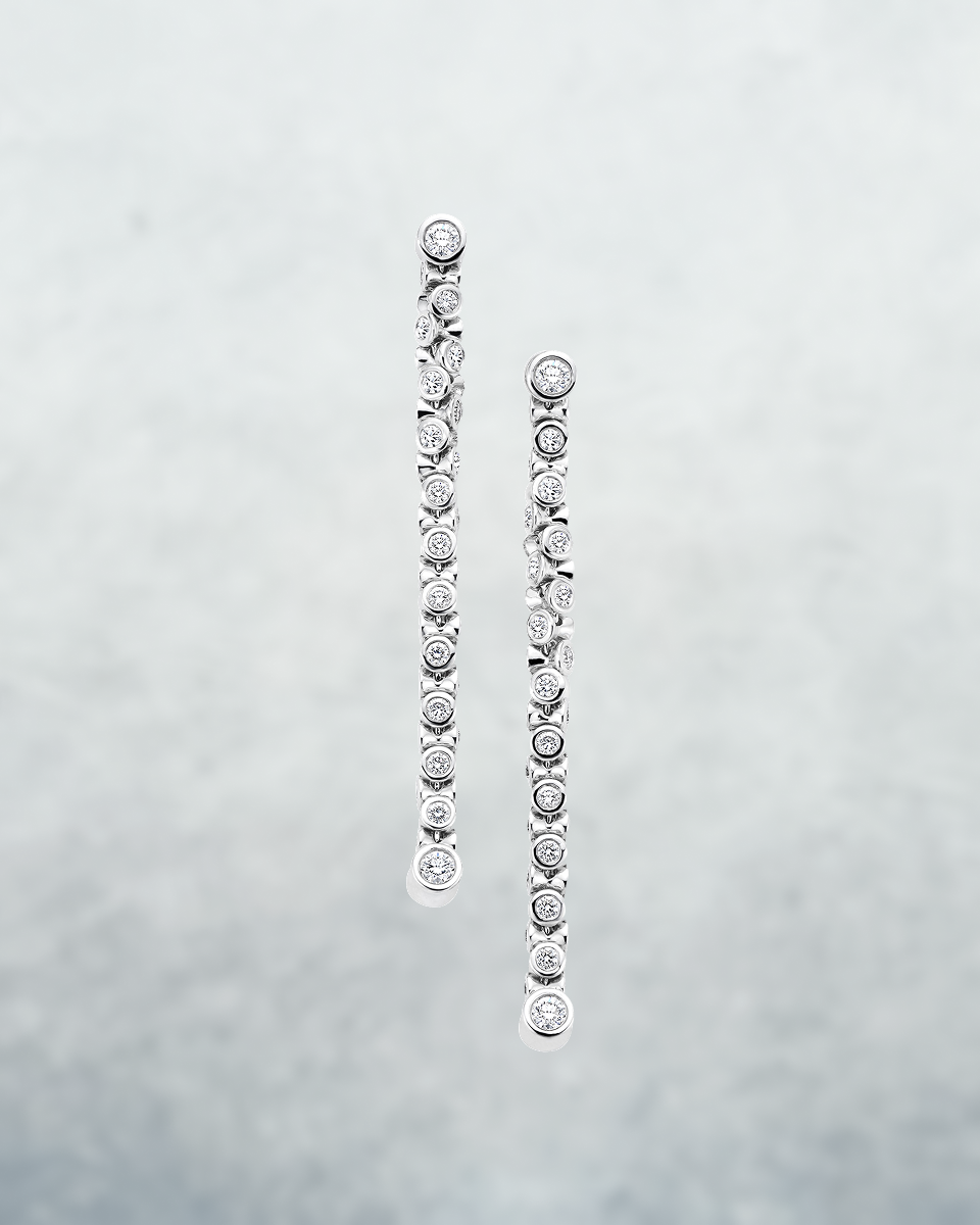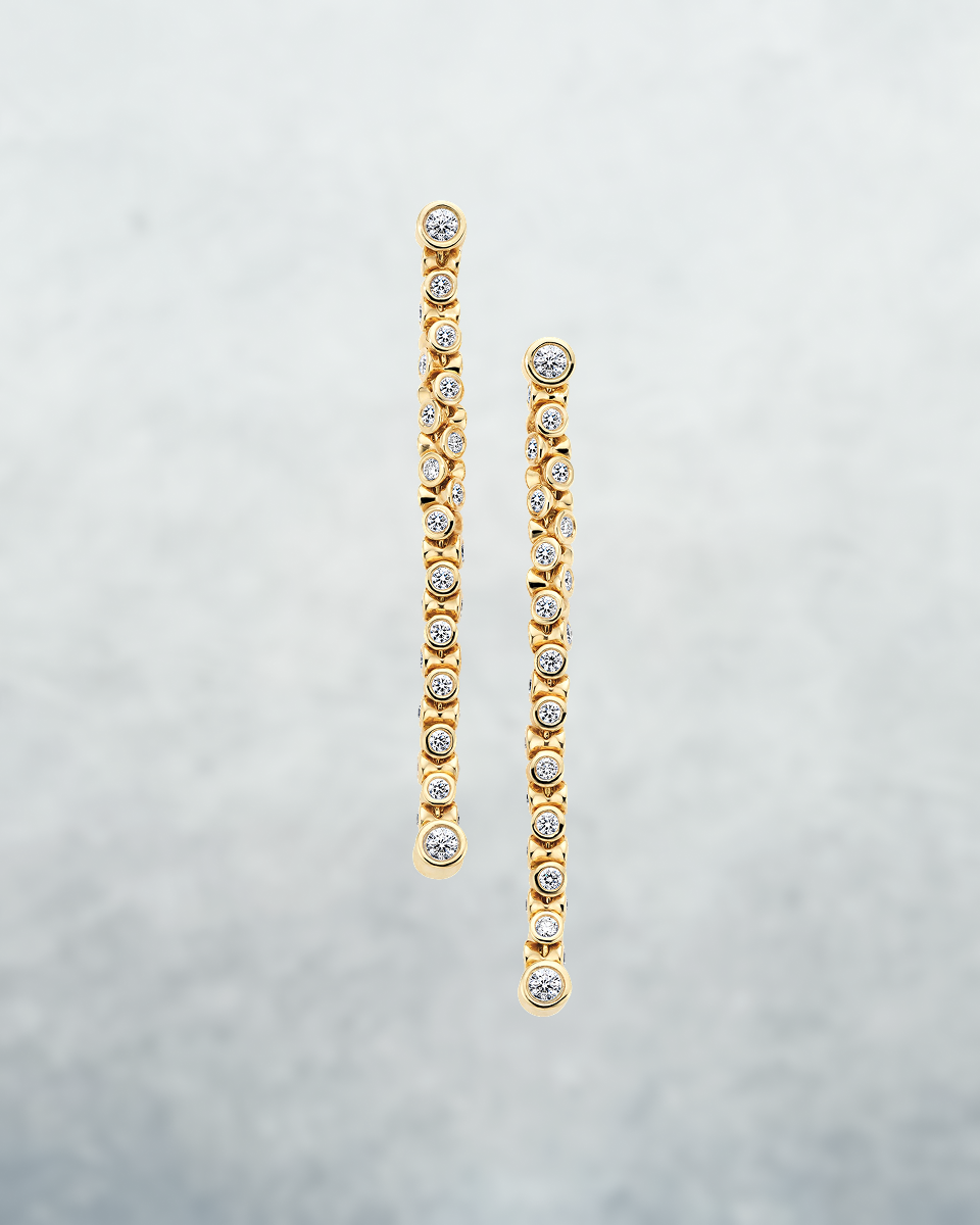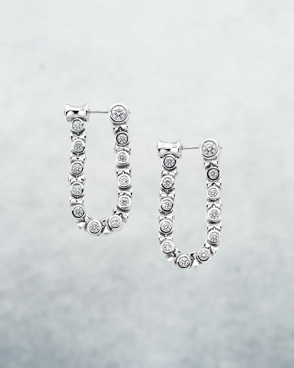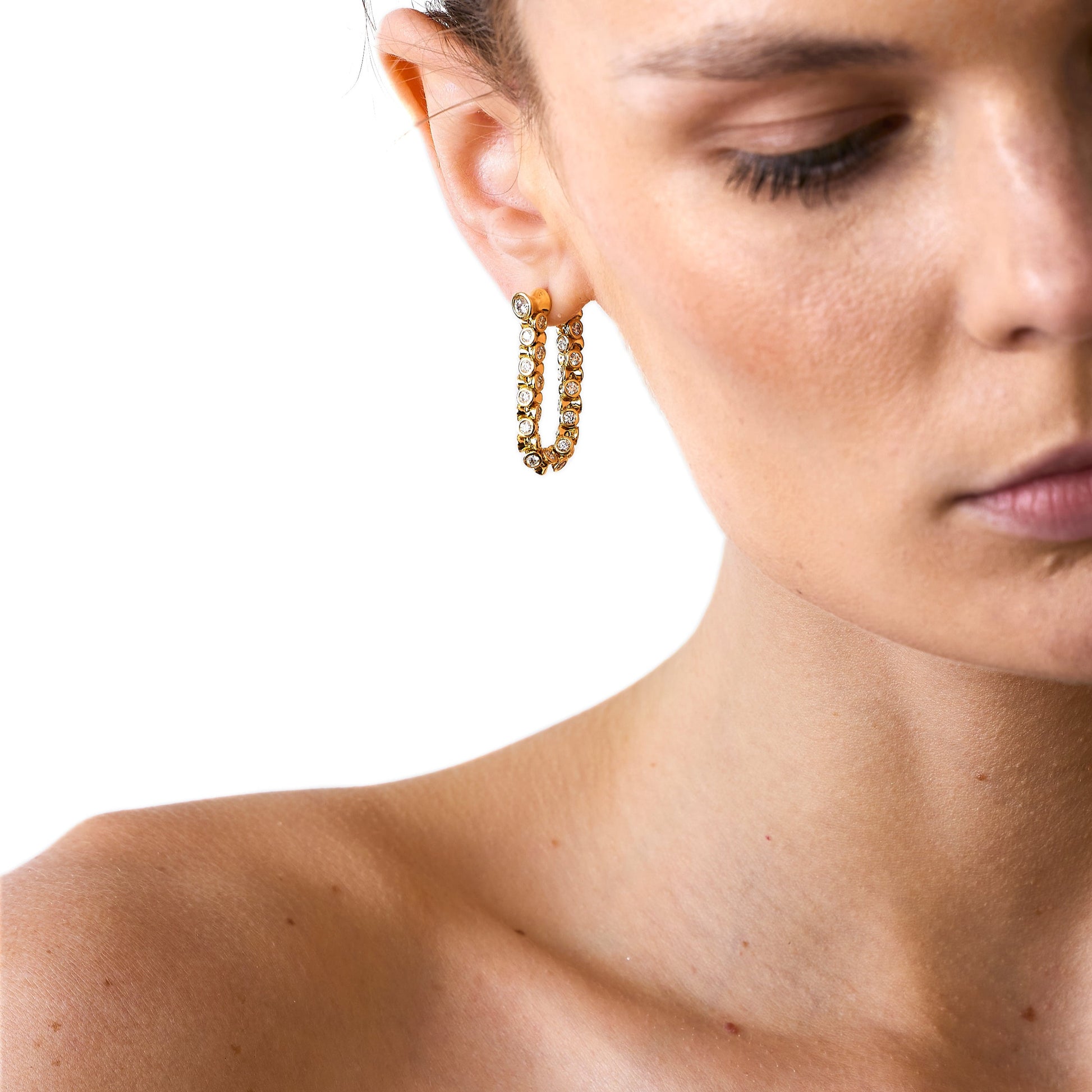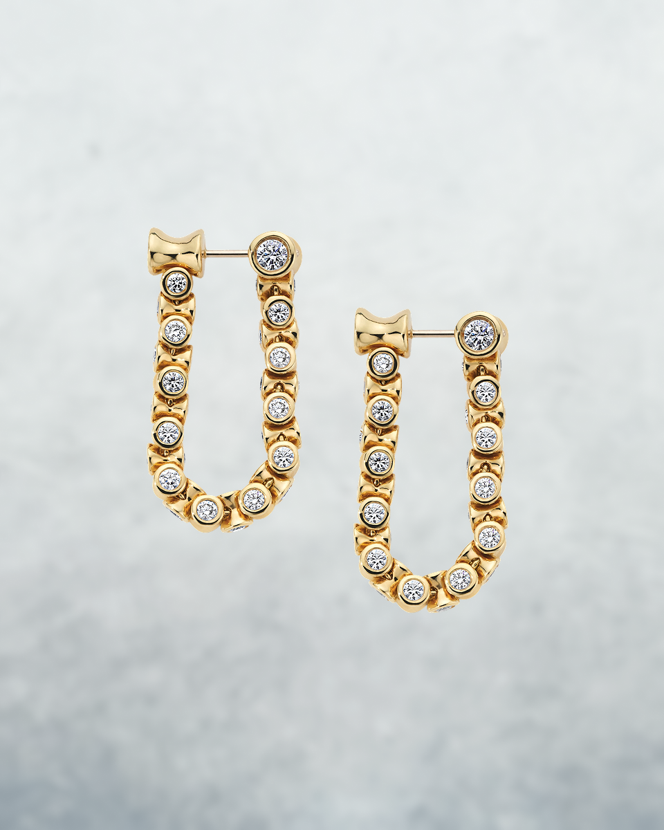 The Ourglass Earrings are both hoops and dangles. Offering dual styling opportunities, the Ourglass Earrings are the only diamond earrings you will ever need. Perfect for day to night. Available in either 18K yellow or white gold.