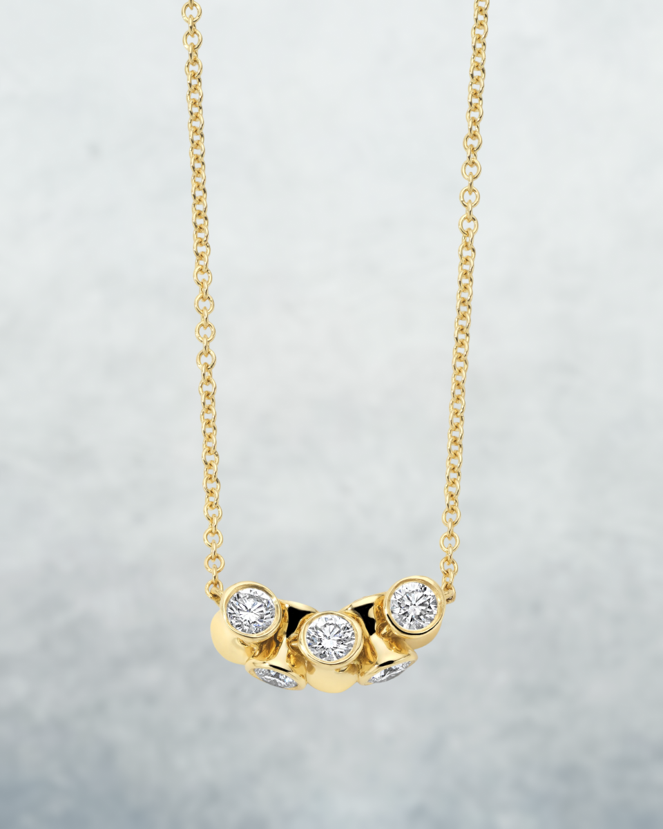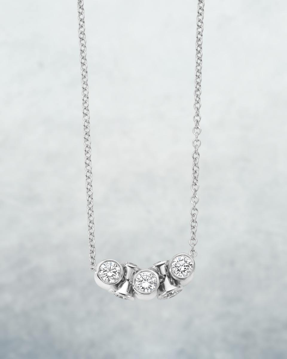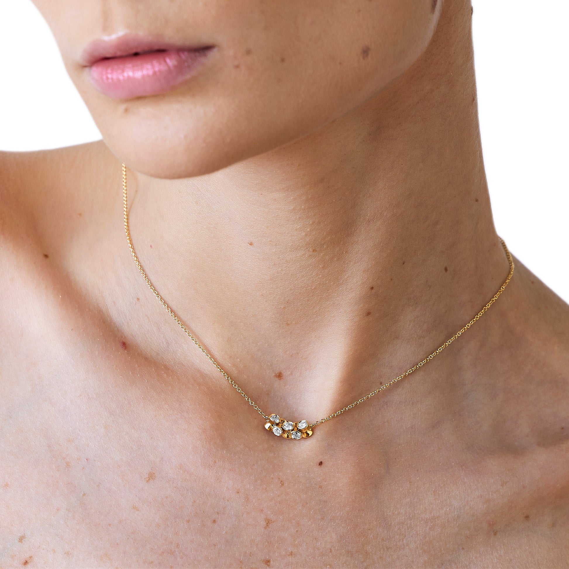 It’s time to watch the neck. The Ourglass Minute is an everyday “don't waste my time” diamond necklace for every minute. With five rotating Ourglass links that kiss your clavicle, the Minute is now. Available in 18K yellow or white gold.