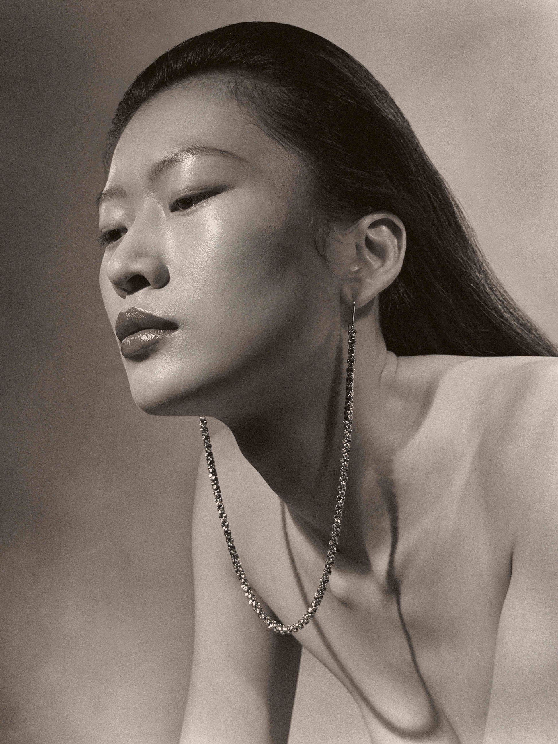 The Ourglass Moment is a modern take on a rivière. Featuring natural diamonds in OX’s proprietary design with rotating links, there is no wrong way to wear the Moment. The fish hook clasp offers multiple styling opportunities from a necklace, wallet chain to even a face veil, from ear to ear. Available in either platinum or 18K yellow gold.