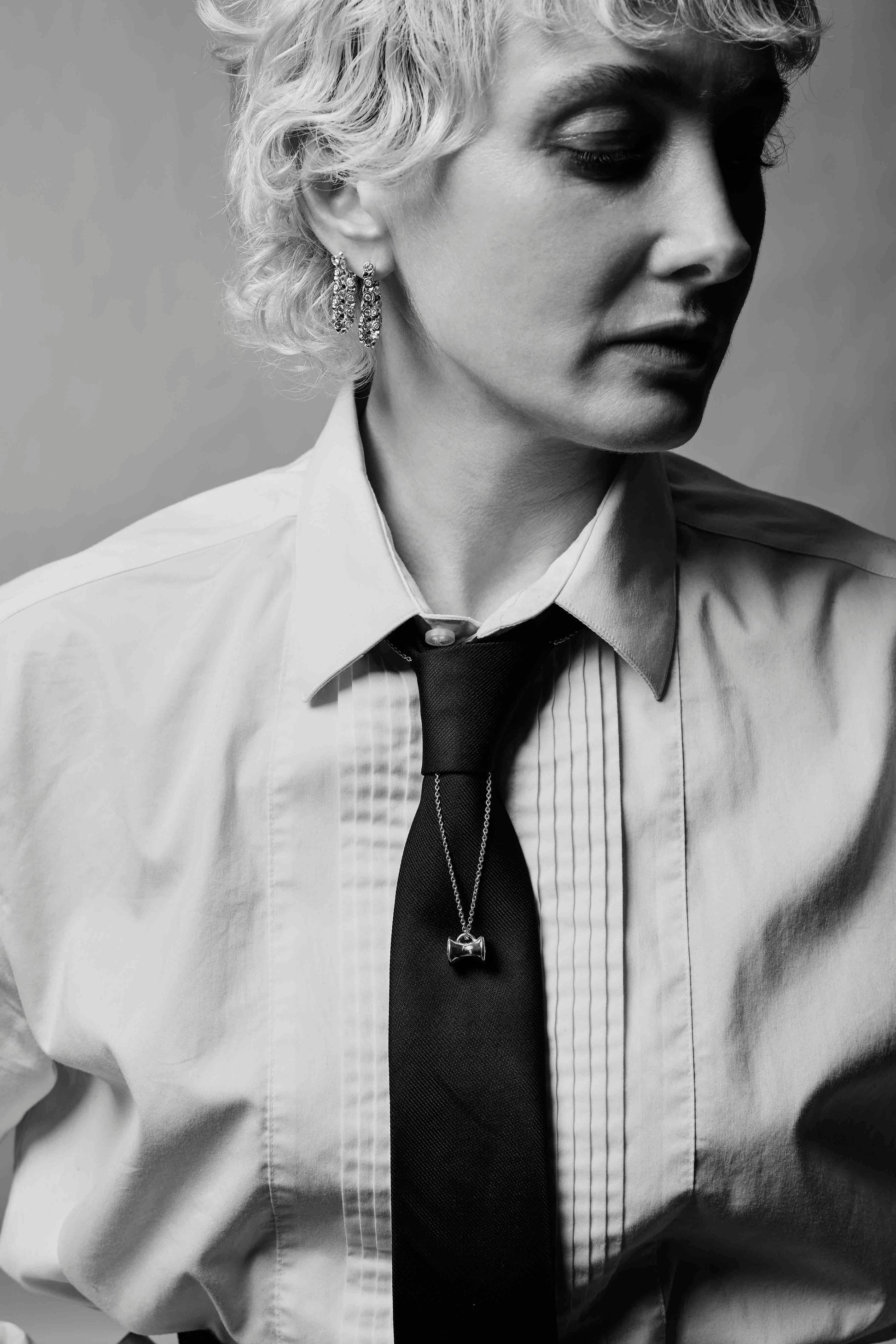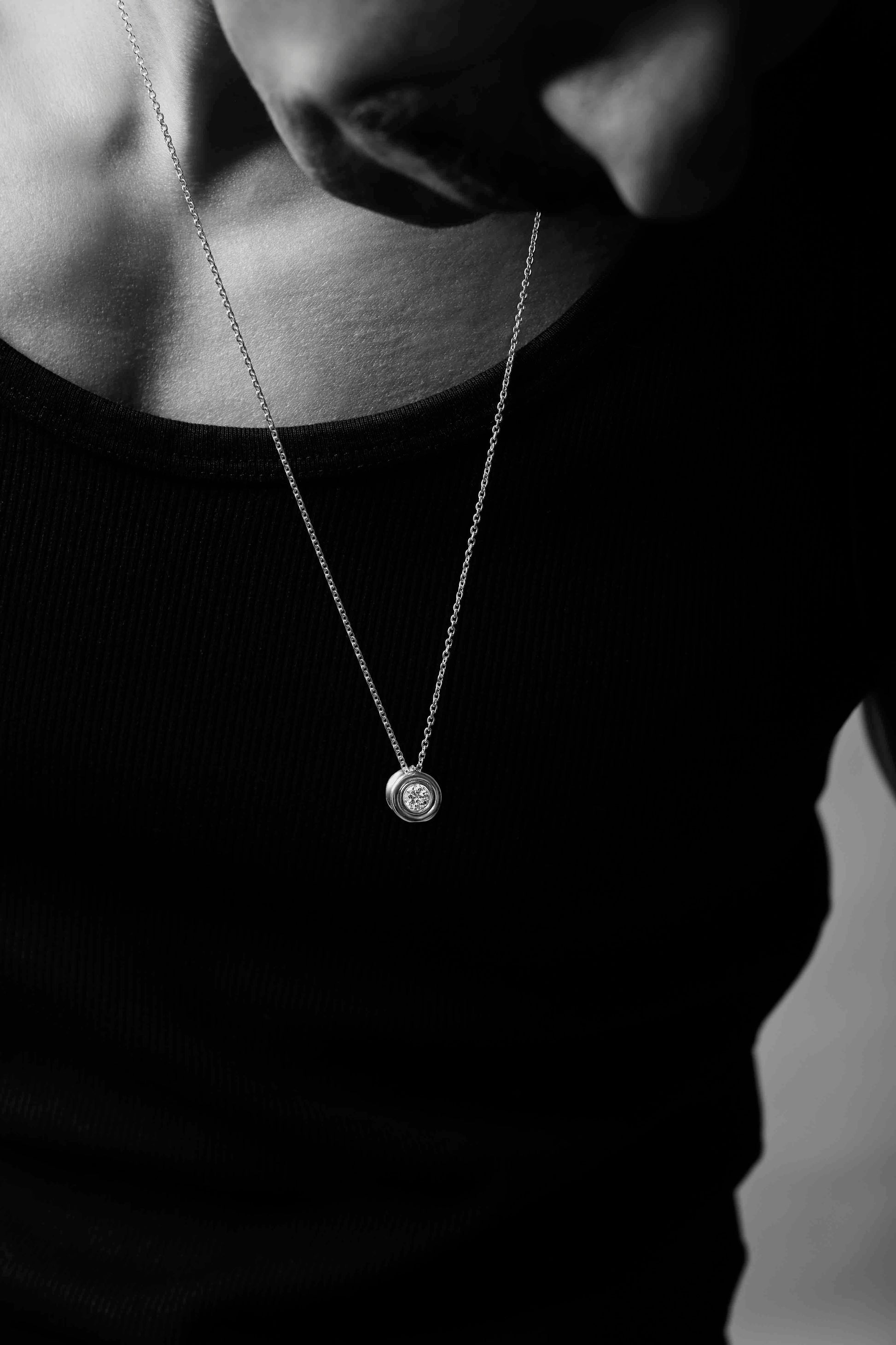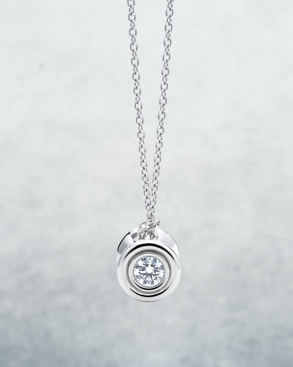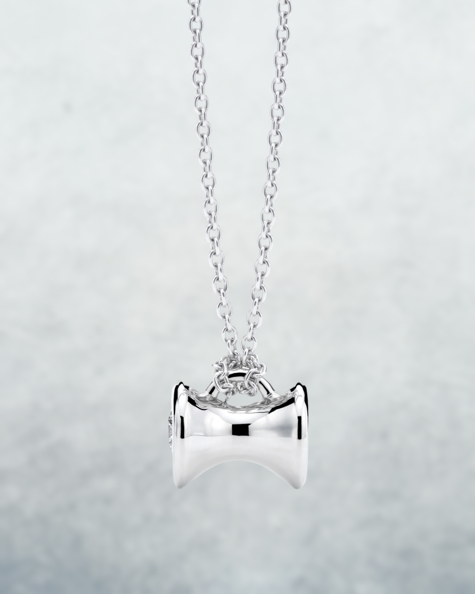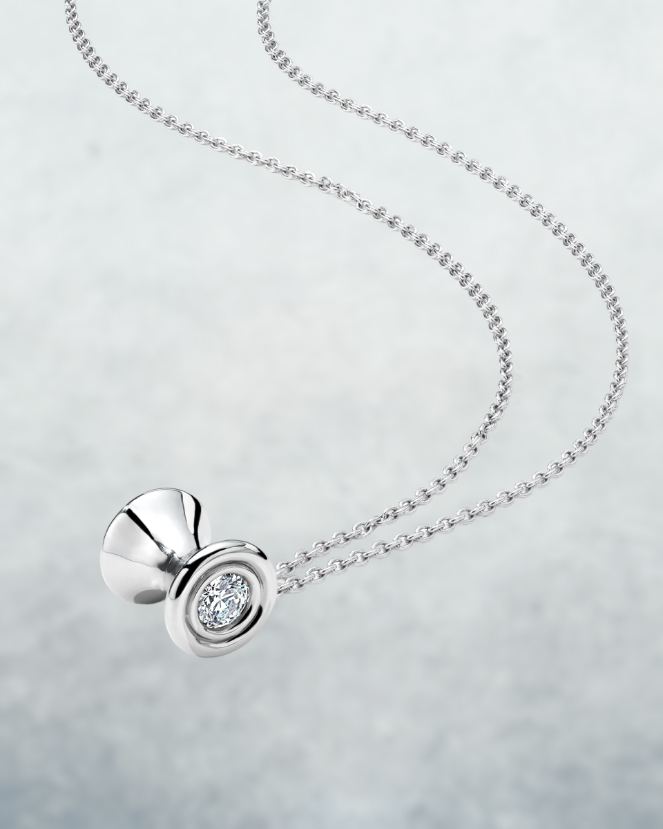 The Ourglass Pendulum is OX's classic silhouette. Flanked with two GIA certified half-carat natural diamonds on each side, the charm has a weighty feel and smooth curves, reminding one of the constant pull of time. Available in platinum.