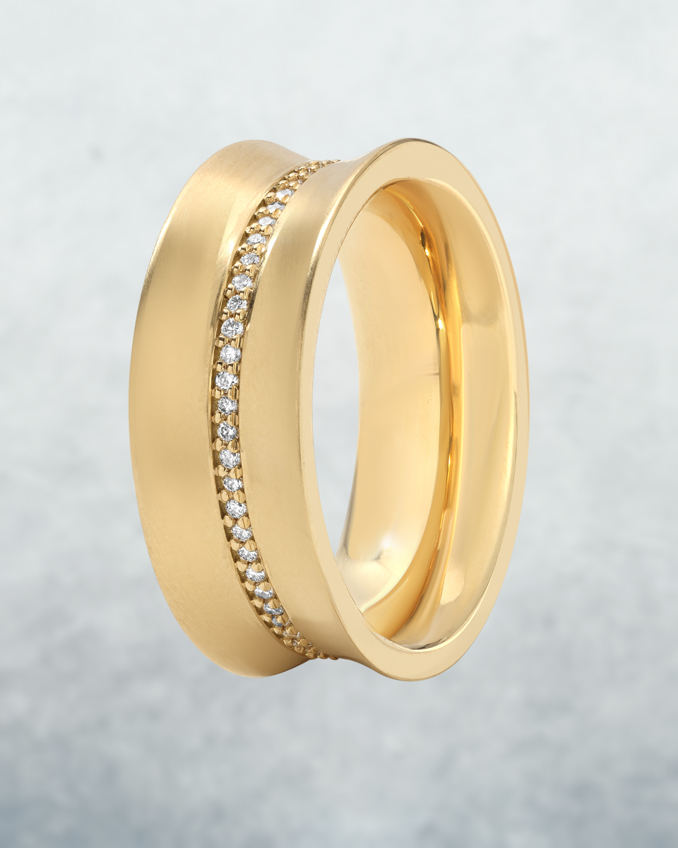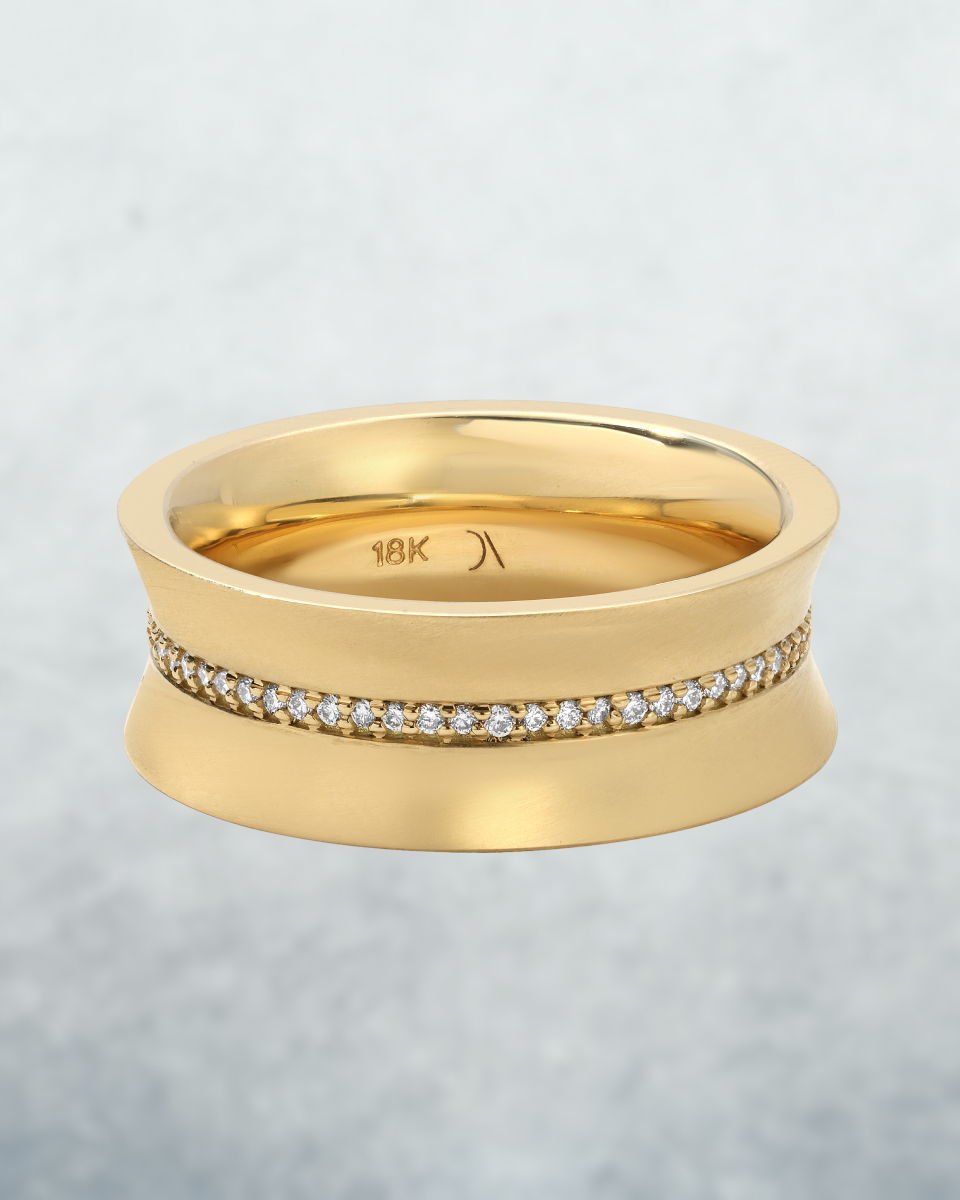 The Signature Band is narrowed at the waist and lined with a row of bead set natural diamonds. With a diamond polish finish on the exterior, this is perfect for stacking or handsome on its own. Available in 18K yellow gold.